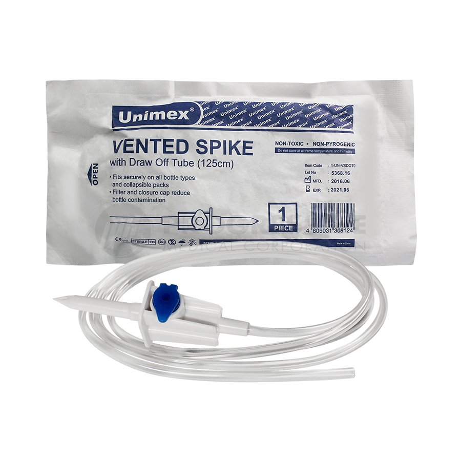 Unimex Vented Spike with Draw-off Tube is designed to deliver medication in fixed dosage volume.